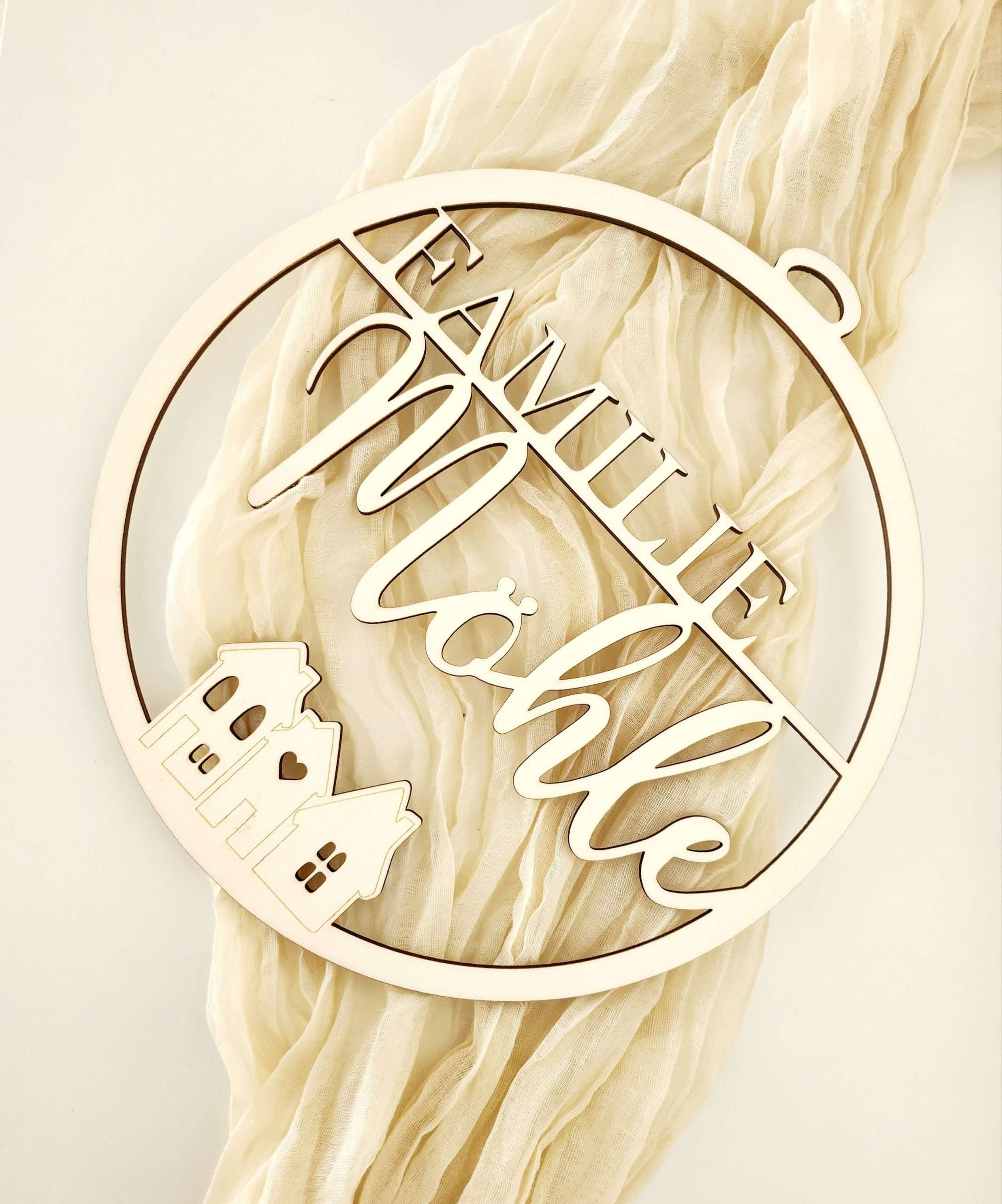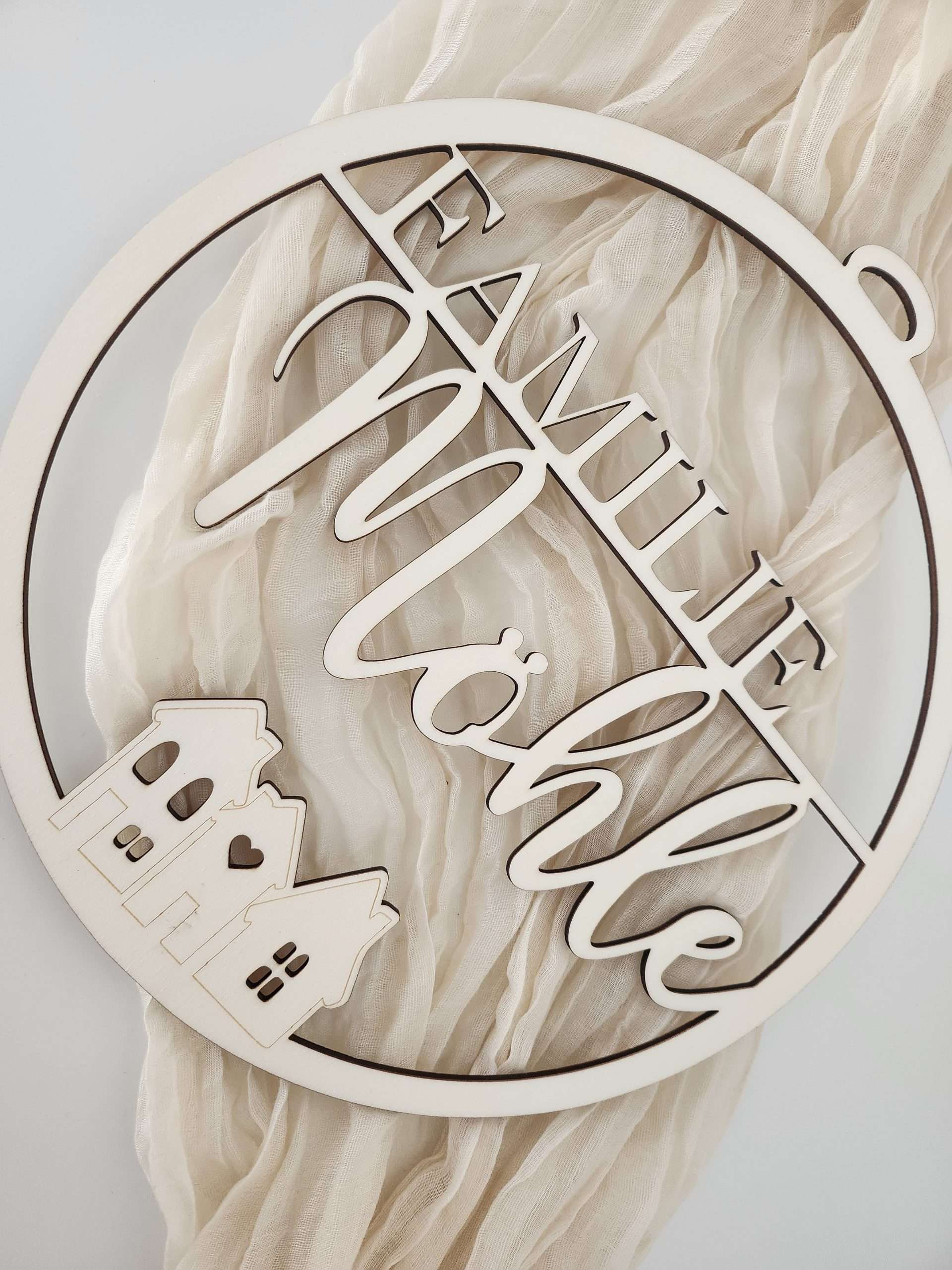 Das Familienschild mit Häuser aus Holz ist das perfekte Geschenk zum Einzug.