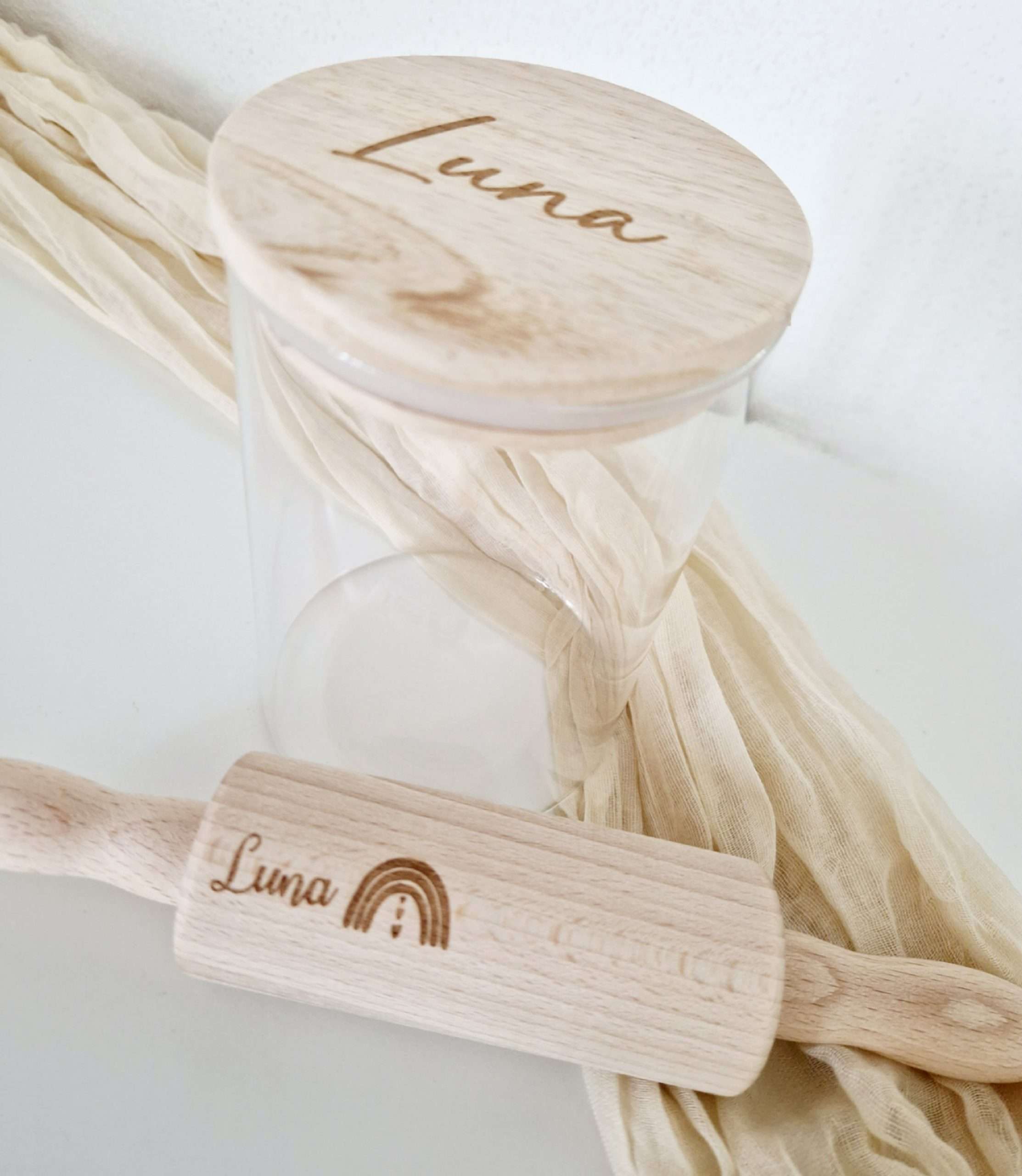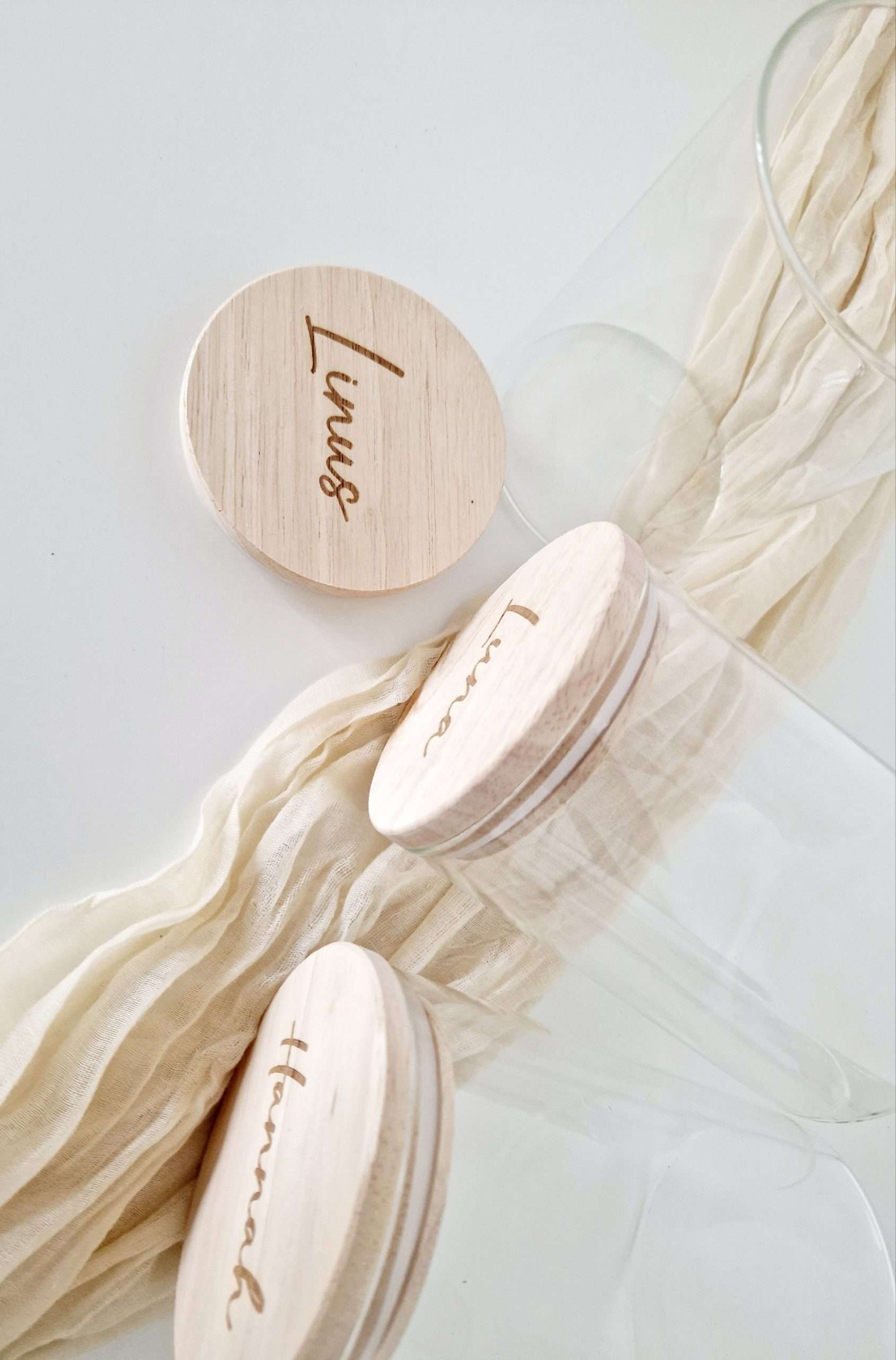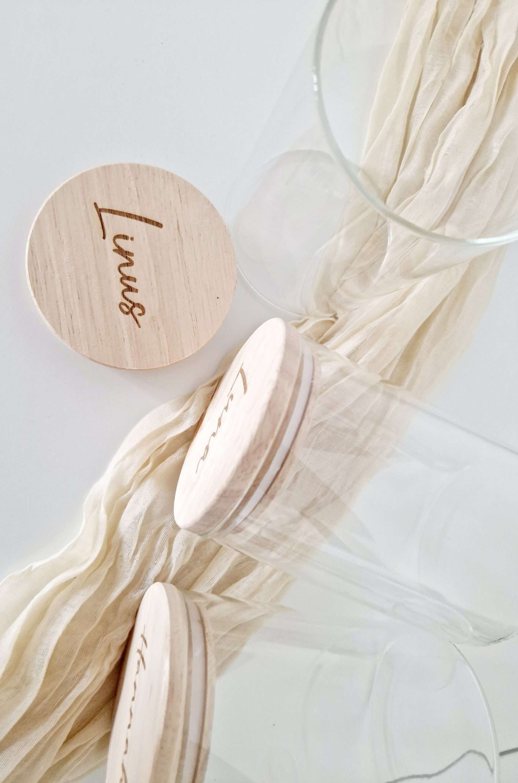Diese Vorratsgläser mit Eichenholzdeckel und einem Volumen von 600 ml haben eine Höhe von 14 cm und einen Durchmesser von 9,5 cm.